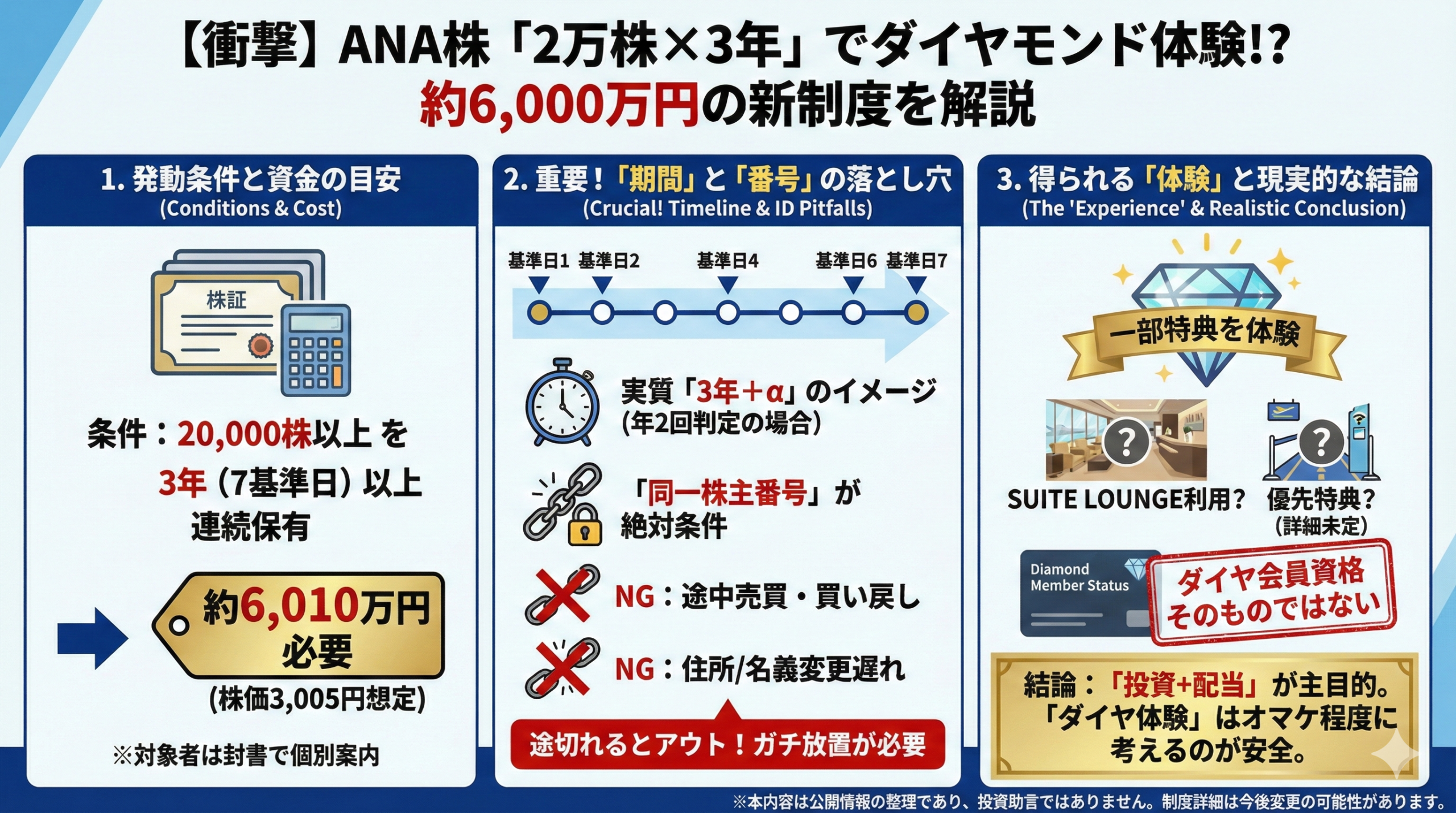 【衝撃】ANA株を「2万株×3年」持つと、ダイヤモンド体験が来る(かも)——約6,000万円で“空港のVIP側”に寄る新制度