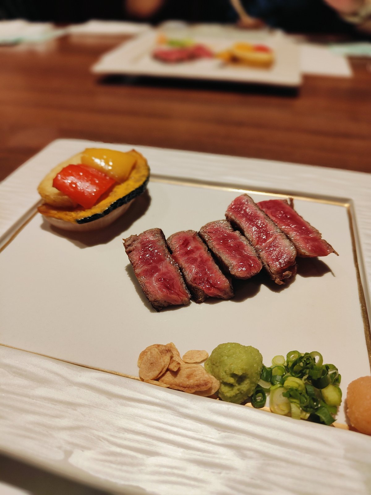 - 黒毛和牛ステーキ:目の前の鉄板で焼かれるライブ感